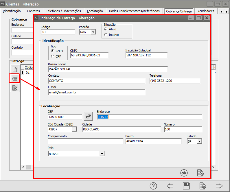 em seguida acesse a aba Cobrança/Entrega e, se houver endereço cadastrado faça a conferência do mesmo.