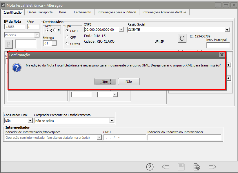 Em seguida acesse o menu Movimentação>Nota Fiscal Eletrônica>Manutenção, pesquise pela NF-e e clique na seta Avança, edite a nota e Salve. O Sistema irá questionar se você deseja gerar um XML para transmissão, clique em SIM.
