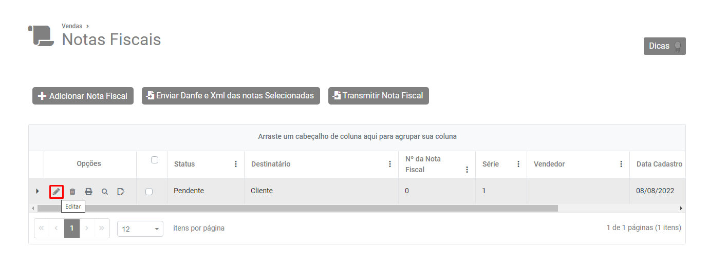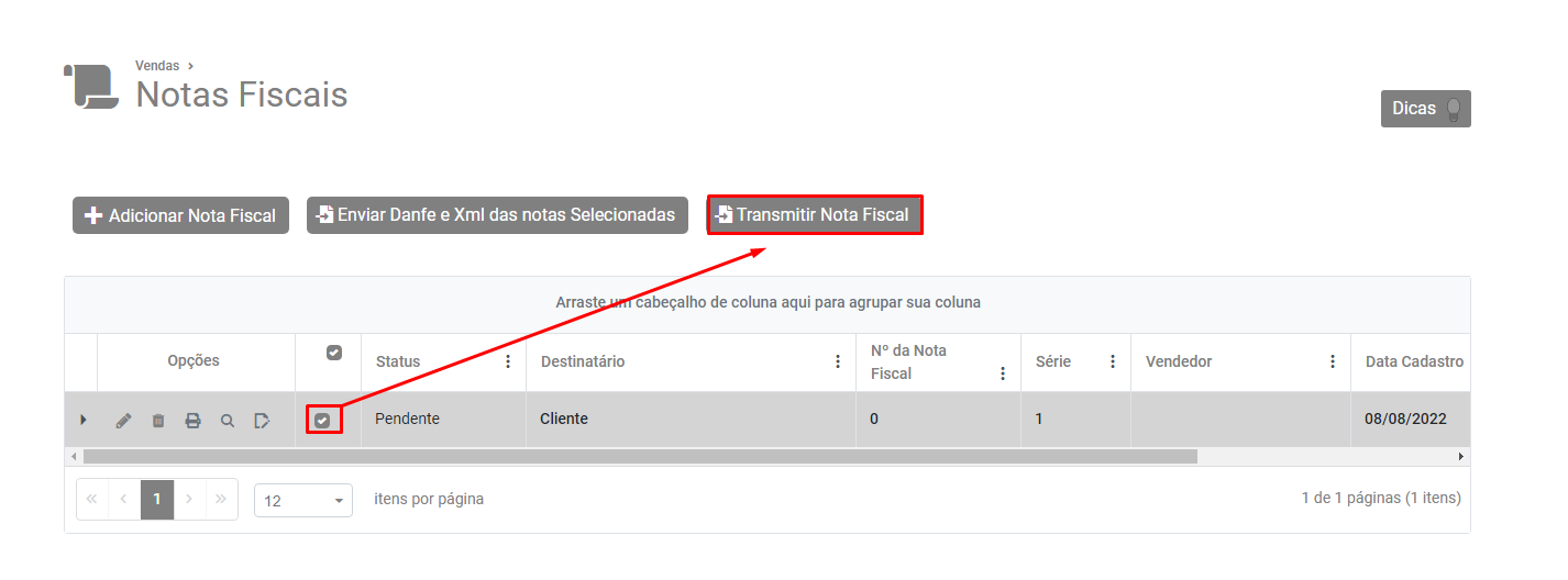 Em seguida Selecione a nota e clique em Transmitir Nota Fiscal