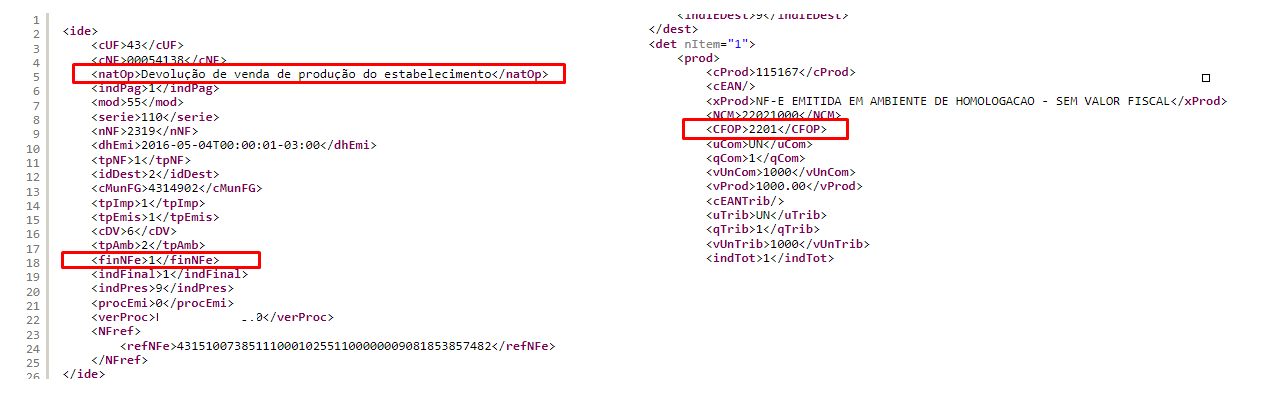 No XML: Os campos associados a essa validação são: <finNFe>, dentro do Grupo <ide> e o campo <CFOP>, dentro do Grupo <det>
