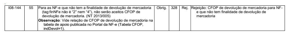 Quando for emitida uma NF-e com CFOP de Devolução de Mercadoria e a Finalidade da NF-e (finNFe) for diferente de 2 - "NF-e Complementar" ou 4 - "Devolução de Mercadoria", será retornado a rejeição "328 - CFOP de devolução de mercadoria para NF-e que não tem finalidade de devolução de mercadoria".
