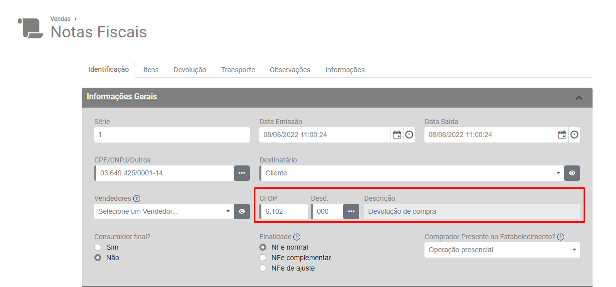 Acesse a aba Identificação e confira o CFOP utilizado, verifique se é um CFOP de devolução.