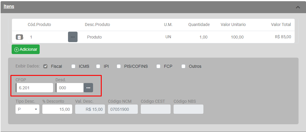 Em seguida, acesse a aba Itens e confira o CFOP utilizado para cada Item da Nota Fiscal.