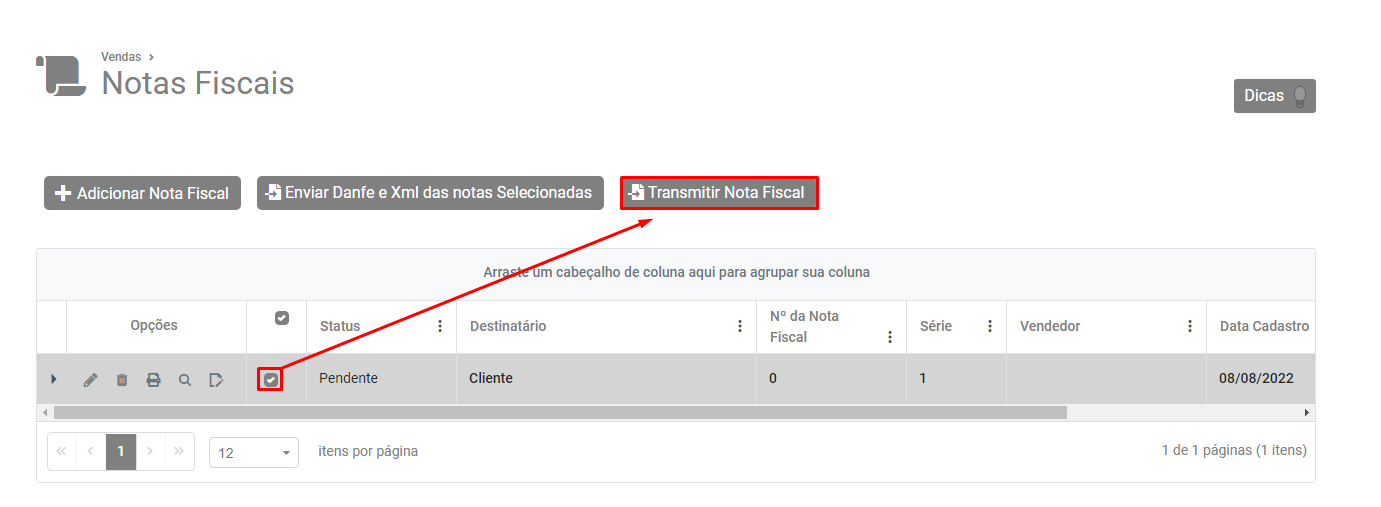 Selecione a NFe e em seguida clique no botão Transmitir Nota Fiscal.