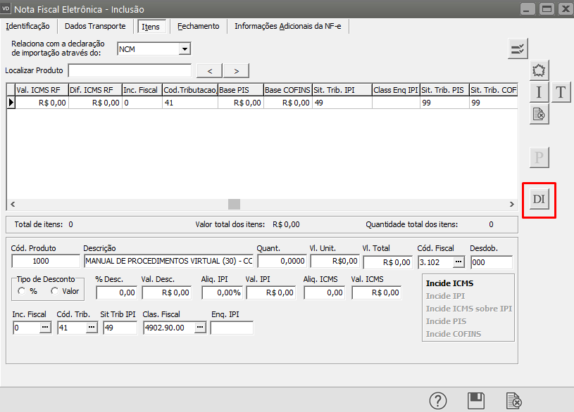 Acesse a aba Itens e clique no botão "DI"