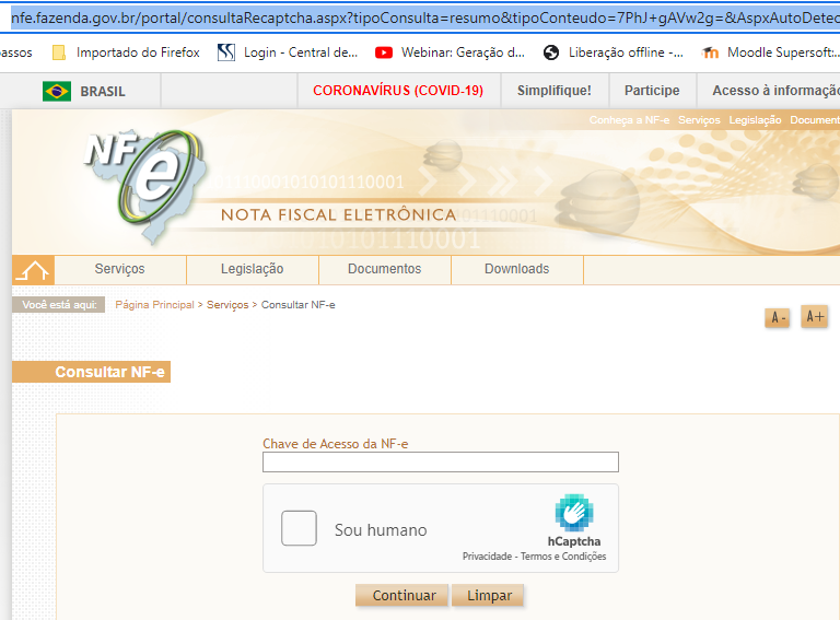 Acessar o site da Sefaz https://www.nfe.fazenda.gov.br/portal/consultaRecaptcha.aspx?tipoConsulta=resumo&tipoConteudo=7PhJ+gAVw2g=&AspxAutoDetectCookieSupport=1