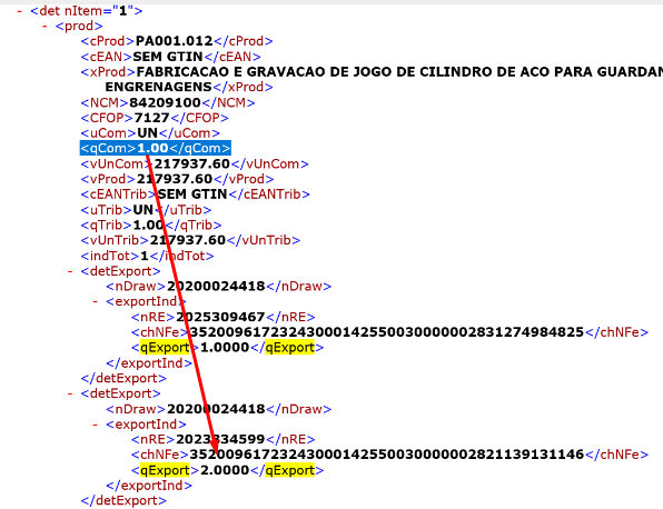 Exemplo: na imagem do XML a seguir é possível verificar que as quantidades não fecham, ou seja, a Tag qCom está com o valor 1 e se somar as Tags qExport a quantidade fica maior: