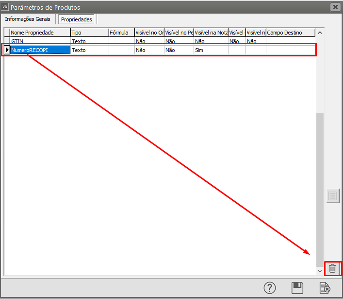 Observação: Caso haja algum produto que já utilizou a propriedade RECOPI em algum momento não será possível excluir a Propriedade.