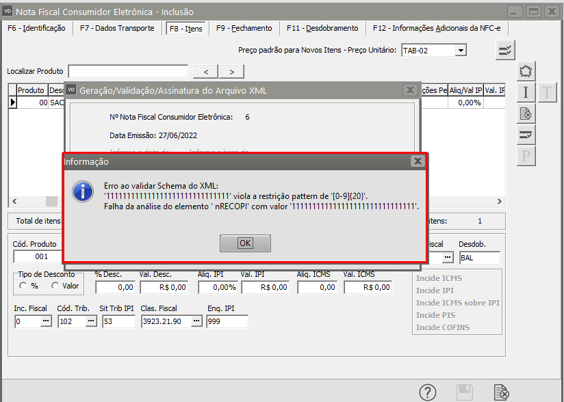 2) Caso realmente, o documento a ser emitido seja uma NFC-e (modelo 65) o grupo RECOPI pode ter sido informado indevidamente,