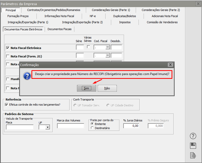 Isso forçará o Sistema a questionar se você deseja criar a propriedade RECOPI, clique em sim.