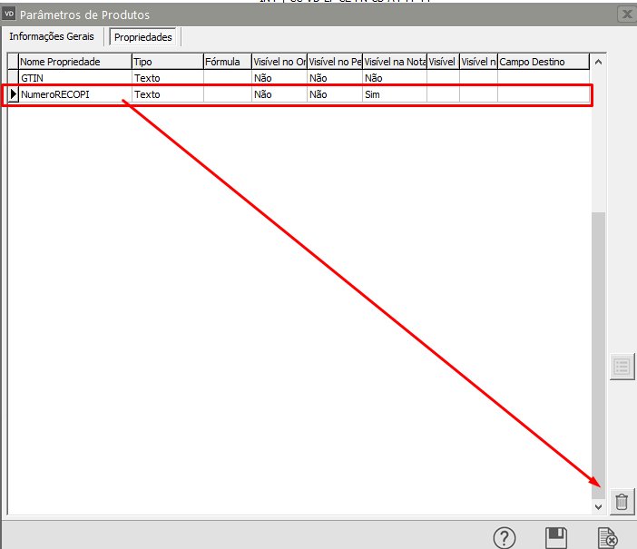 Caso sua empresa não seja obrigada a informar a propriedade RECOPIM, acesse o menu Manutenção>Empresas>Parâmetros dos Produtos, clique na aba Propriedades e exclua a Propriedade RECOPI que foi criada indevidamente.