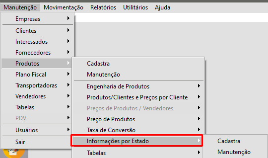 Quando o produto que está sendo vendido for com CST 51 (diferimento) será necessário acessar o menu Manutenção>Produtos>Informações por Estado>Manutenção