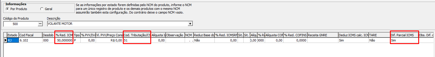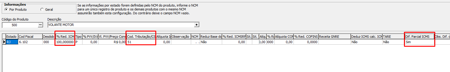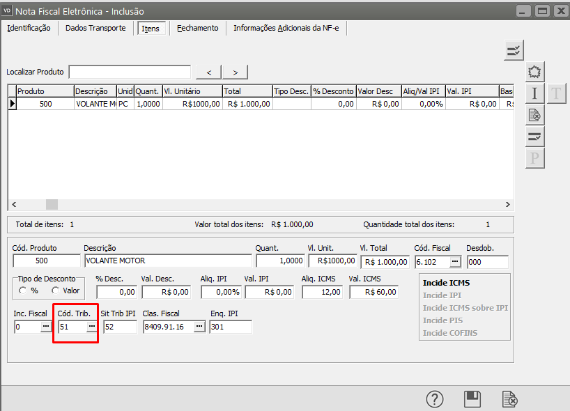 Informar no Item o Produto cadastrado na mesma tabela, o sistema carregará automaticamente o Código de Tributação 51