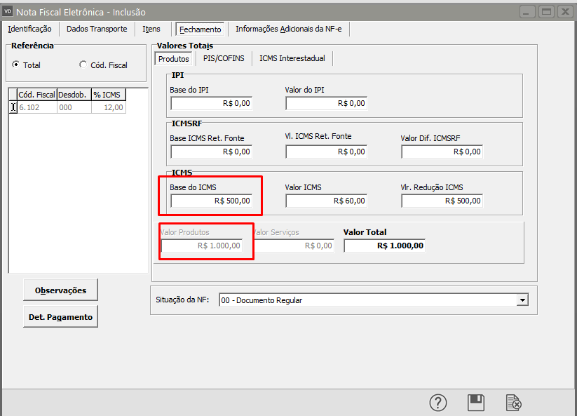 E na aba de Fechamento da NF-e você constatará que foi calculada a redução referente ao Diferimento do código 51