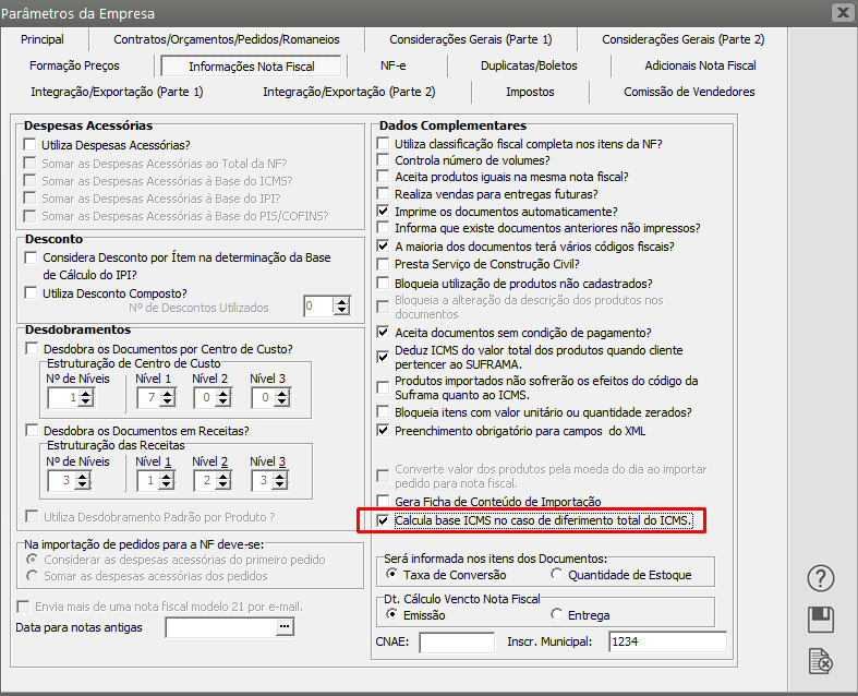 Caso em sua empresa exista o Diferimento TOTAL e o Sistema deva apresentar a Base de ICMS mesmo o valor do ICMS sendo zerado, acesse o menu Manutenção>Empresas>Parâmetros Adicionais da Empresa - aba Informações Nota Fiscal e assinale a opção "Calcula base ICMS no caso de diferimento total do ICMS."