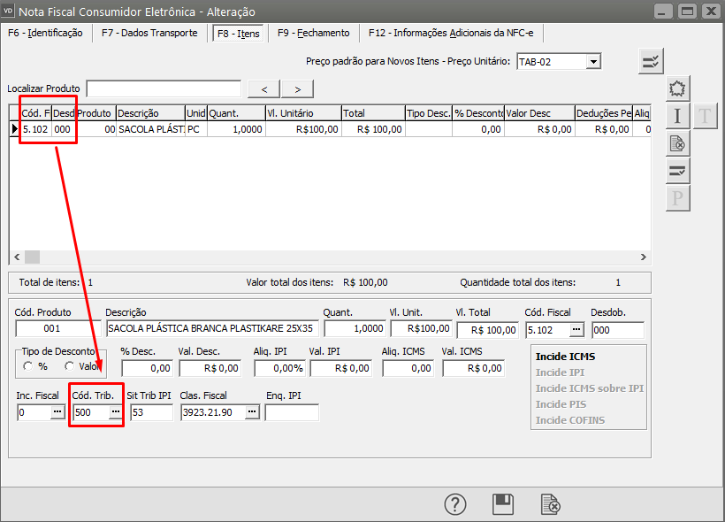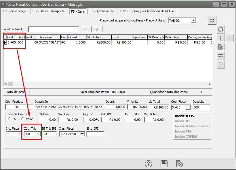 Acesse a aba itens e corrija ou o CFOP utilizado ou o código de tributação, em seguida salve novamente a NFC-e. Salve a Nota e o Sistema irá questionar se você deseja gerar um novo XML para Transmissão, clique em SIM.