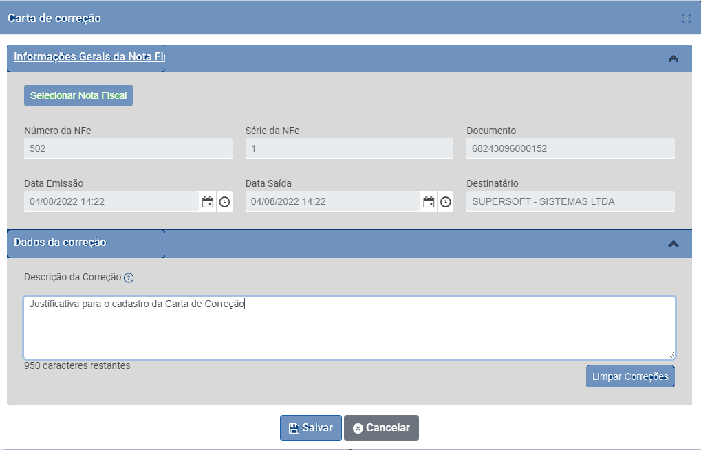 Em seguida confira as informações, preencha corretamente o campo destinado à Justificativa da Carta de Correção que deverá conter no mínimo 15 caracteres.