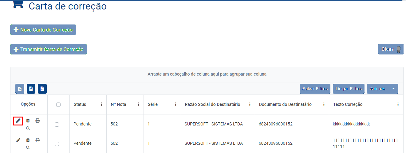 Pesquise pela Carta de Correção rejeitada pela Sefaz e faça a edição da mesma.