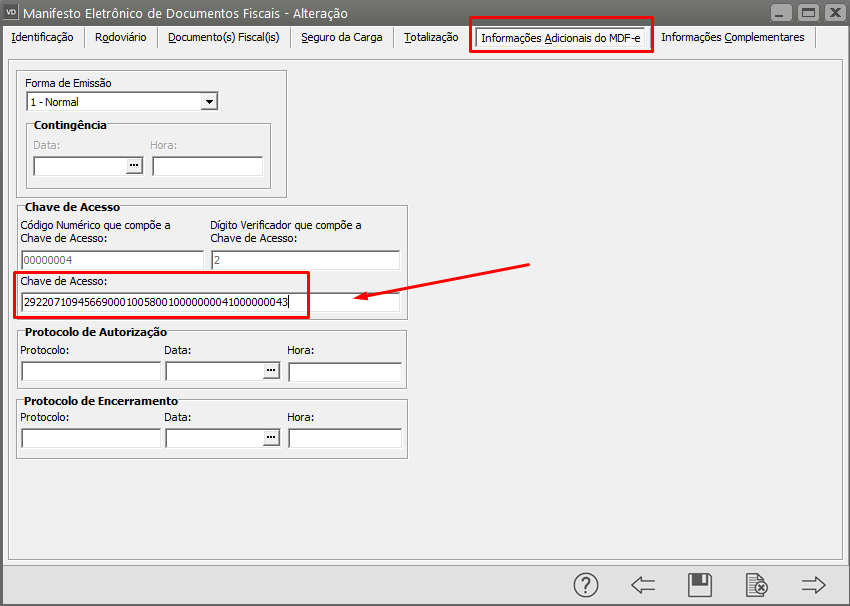 Para a correção, acesse o menu Movimentação>MDF-e>Manutenção, pesquise pelo Manifesto rejeitado e clique na seta Avança, em seguida edite o Manifesto e acesse a aba Informações Adicionais do MDF-e.