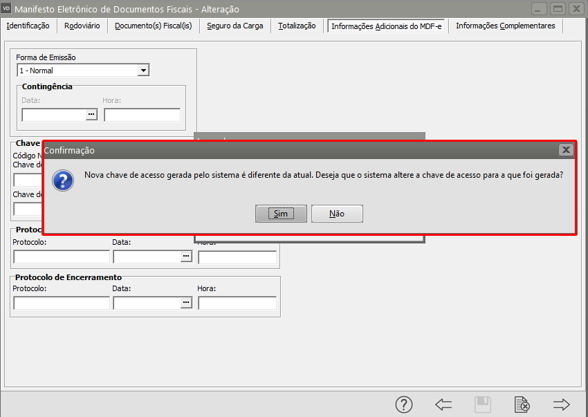 O Sistema irá informar que uma nova chave de acesso foi gerada e é diferente da atual, e questionará se deseja que o sistema altere a chave de acesso para a que foi gerada, clique em SIM