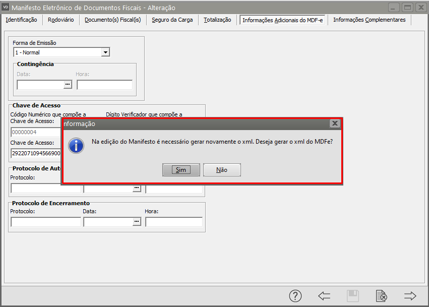 Em seguida será questionado se deseja gerar o xml do MDF-e, clique em SIM.