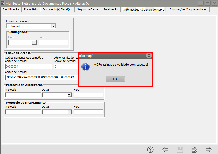Se todas as informações estiverem corretamente cadastradas o sistema irá informar que o MDFe foi assinado e validado com sucesso, clique em OK