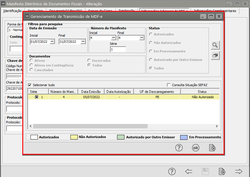 Será aberta a tela do Gerenciamento de Transmissão de MDF-e, clique em OK e faça o envio do mesmo para a SEFAZ.