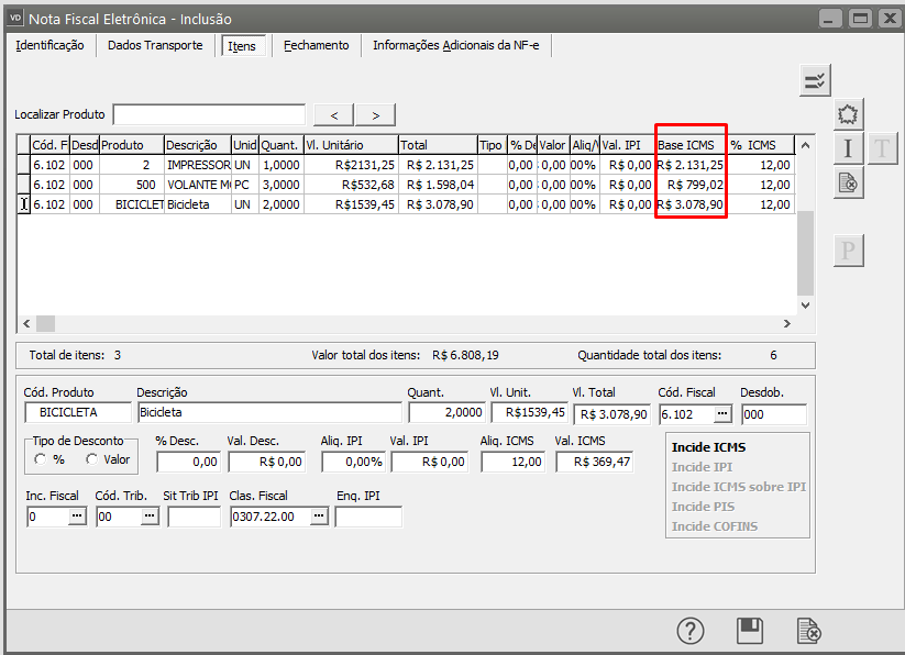 Em seguida acesse a aba Fechamento e verifique se o valor que consta no campo Base do ICMS é o mesmo encontrado no somatório dos itens.