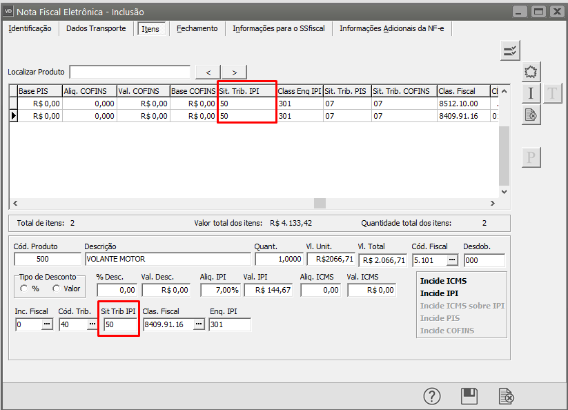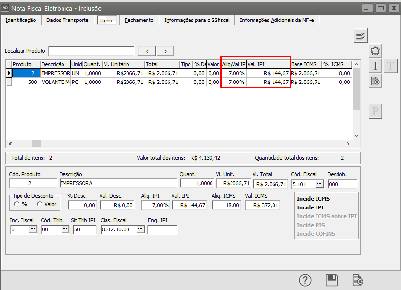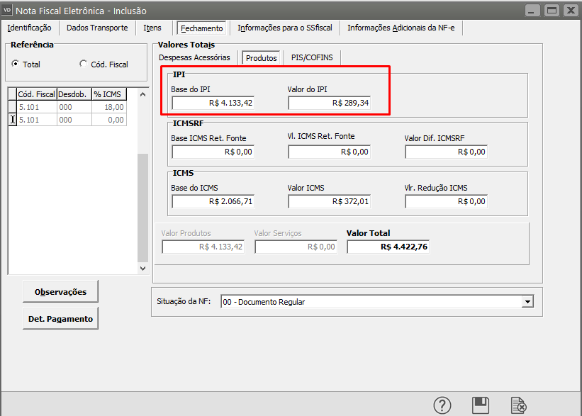 Em seguida acesse a aba Fechamento e verifique se o valor total do IPI de todos os itens está igual ao valor informado no campo Valor do IPI