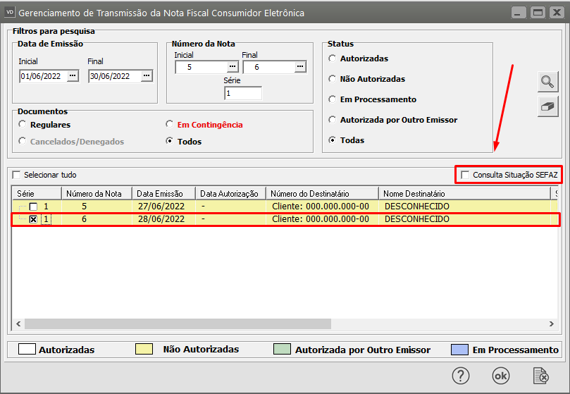Pesquise pela Nota Fiscal já autorizada na Sefaz e que você cadastrou as informações corretamente e clique no botão Consulta Situação SEFAZ.
