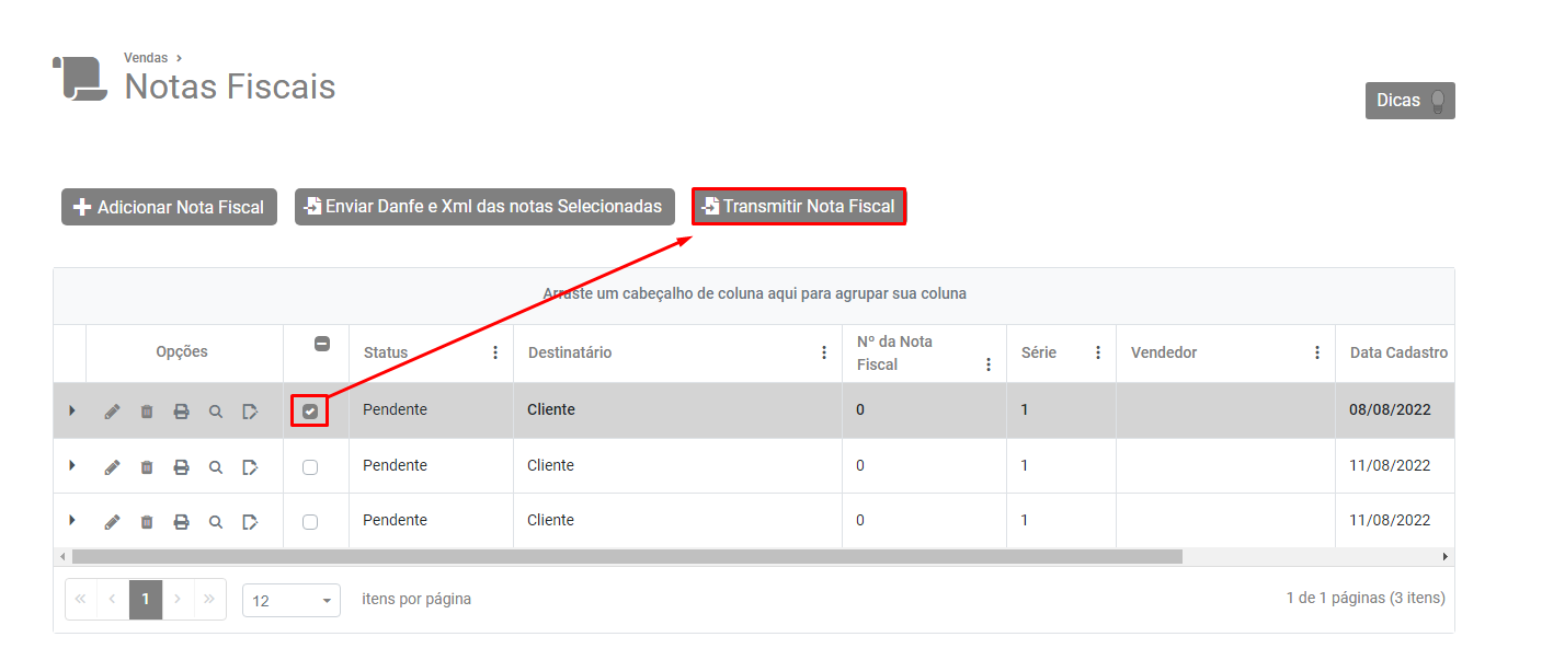 Selecione a Nota e clique no botão Transmitir Nota Fiscal