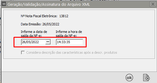 Neste momento será apresentada a tela informando qual a data e horário em que o XML está sendo gerado, confira a informação e se o horário estiver divergente do horário de Brasília, ou em caso de fuso horário, estiver divergente do horário de seu estado, corrija a informa (data e horário) e clique em Ok.