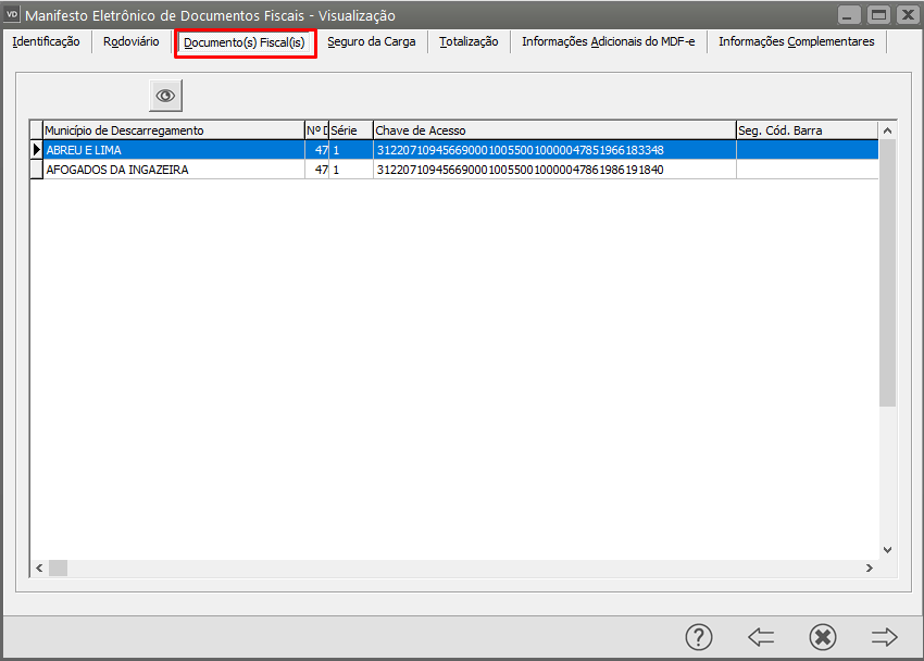 Acesse o menu Movimentação>MDF-e>Movimentação e pesquise pelo Manifesto rejeitado, em seguida acesse a aba Documentos Fiscais e verifique as chaves de acesso das NF-e informadas.