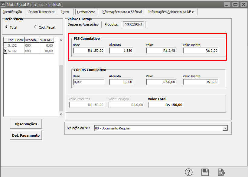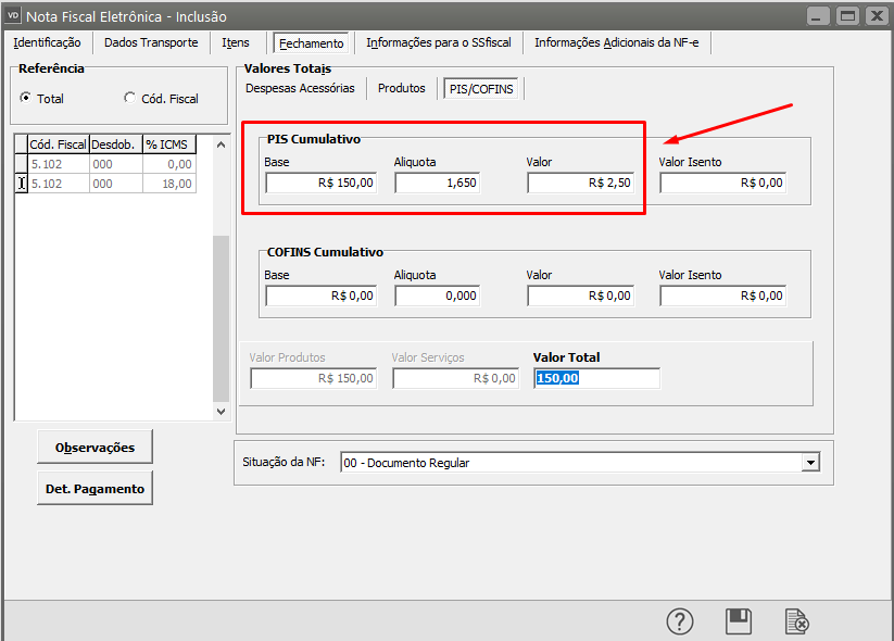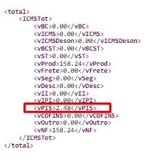 Descrição: Total do PIS difere do somatório dos itens sujeitos ao ICMS