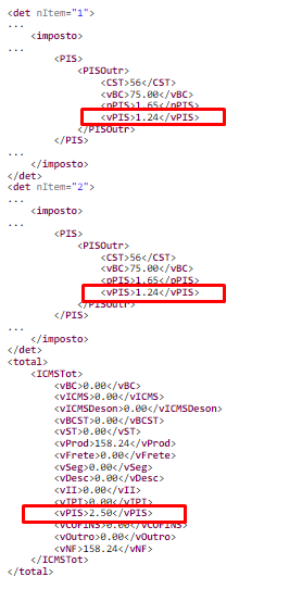 O cálculo do Total do PIS da NF-e é feito a partir do somatório do Valor do PIS de cada item: