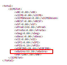 O cálculo do Total do campo vOutro da NF-e é feito a partir do somatório do Valor dos campos vOutro de cada item: