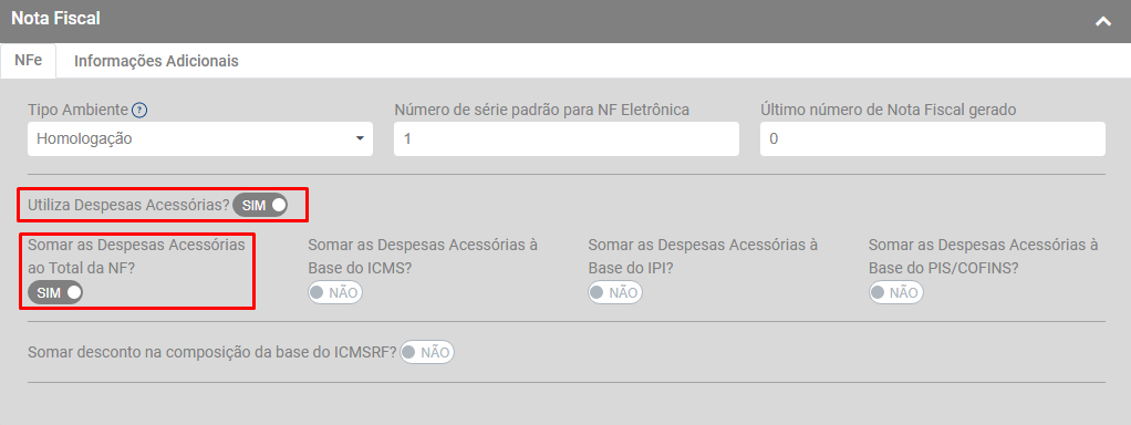 Estiver definido que Utiliza Despesas Acessórias e que Soma essas despesas acessórias no total da Nota