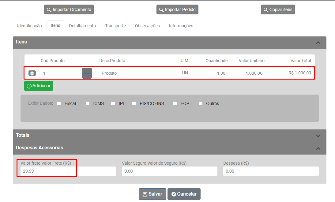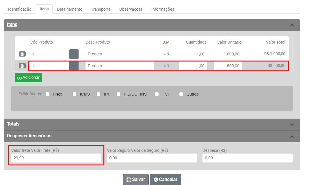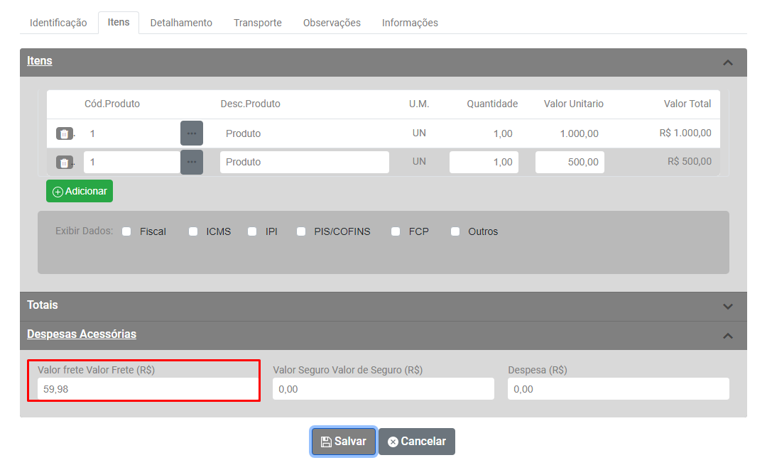 Em seguida acesse a aba Itens, campo Despesas Acessórias e acerte a informação digitada no campo correspondente.