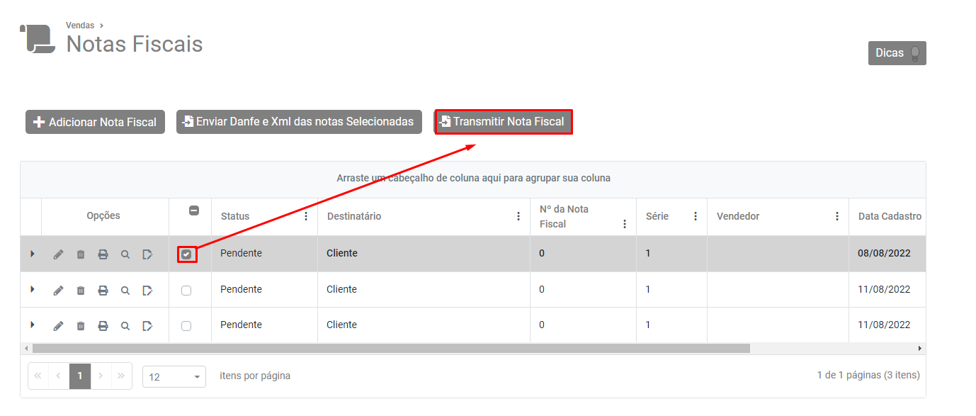 Em seguida salve a NF-e, selecione no Grid e clique no botão Transmitir Nota Fiscal.
