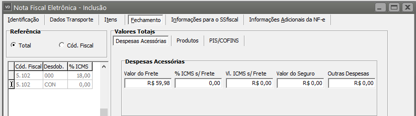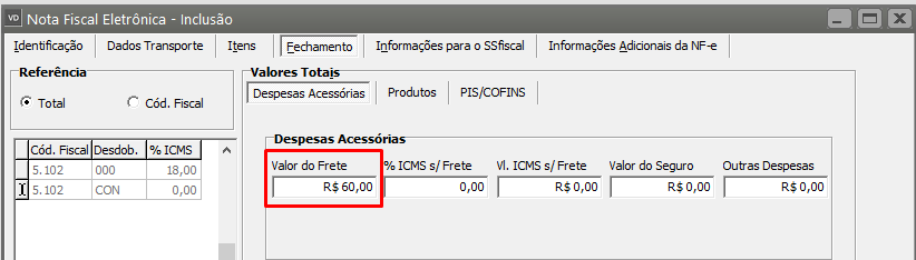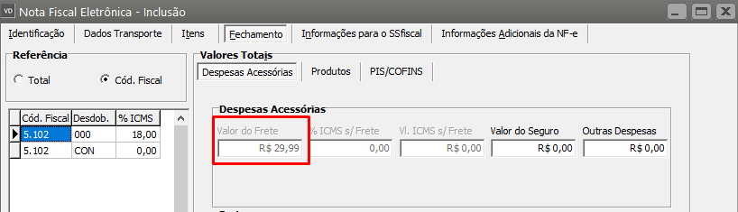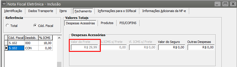Em seguida acesse a aba Fechamento, sub aba Despesas Acessórias e acerte a informação digitada no campo Valor do Frete.