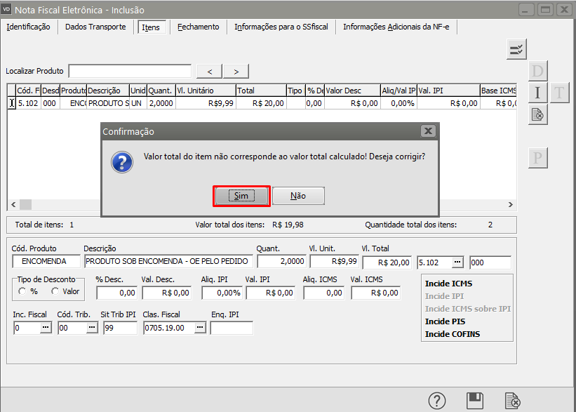 Ao acessar a aba Fechamento o Sistema apresentará mensagem informando que o Valor total do item não corresponde ao valor total calculado, Deseja corrigir?