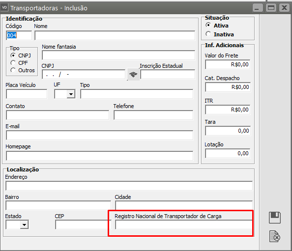 Caso exista a necessidade de alteração deste Registro, acesse o menu Manutenção>Transportadoras>Manutenção, pesquise pelo Código encontrado na tela acima, clique na seta Avança e edite o cadastro, em seguida altere o Registro corretamente.