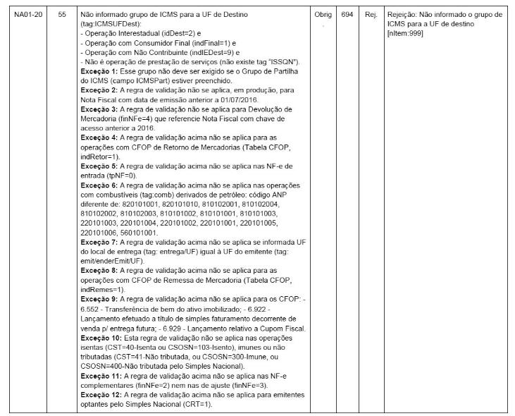 ... Rejeição 694: Não informado o grupo de ICMS para UF de destino.