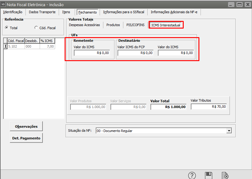 - vICMSUFRemet: Valor do ICMS da UF do Remetente
