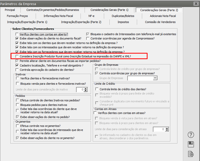 3 - Verificar se é Produtor Rural Contribuinte e em caso afirmativo deverá acessar o menu Manutenção>Empresas>Parâmetros Adicionais da Empresa (aba considerações gerais parte 2) e marcar a opção considerar inscrição do produtor rural com Inscrição Estadual na Impressão do Danfe e no XML