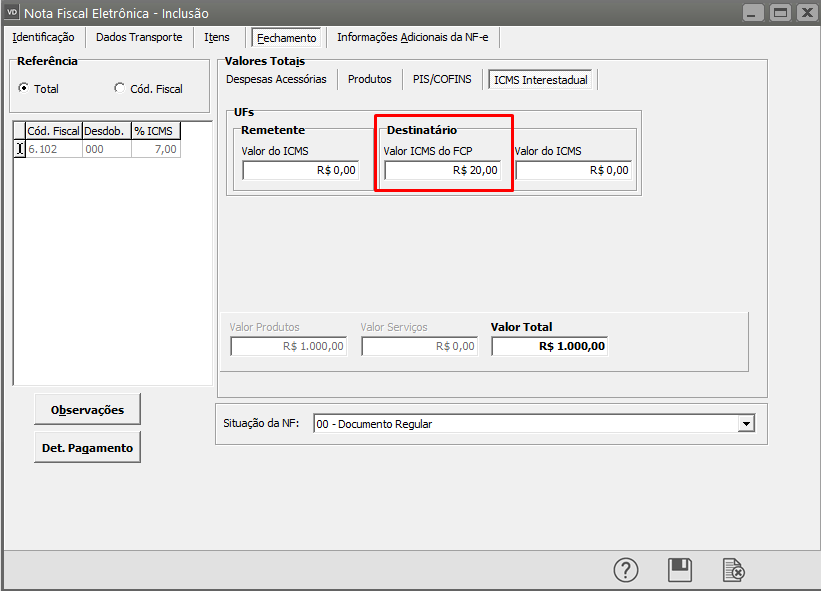 - pFCPUFDest: Alíquota do Fundo de Combate à Pobreza na UF de Destino