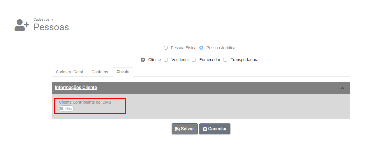 Para verificar se o Cliente está definido com Não Contribuinte, acesse o menu Vendas>Pessoas