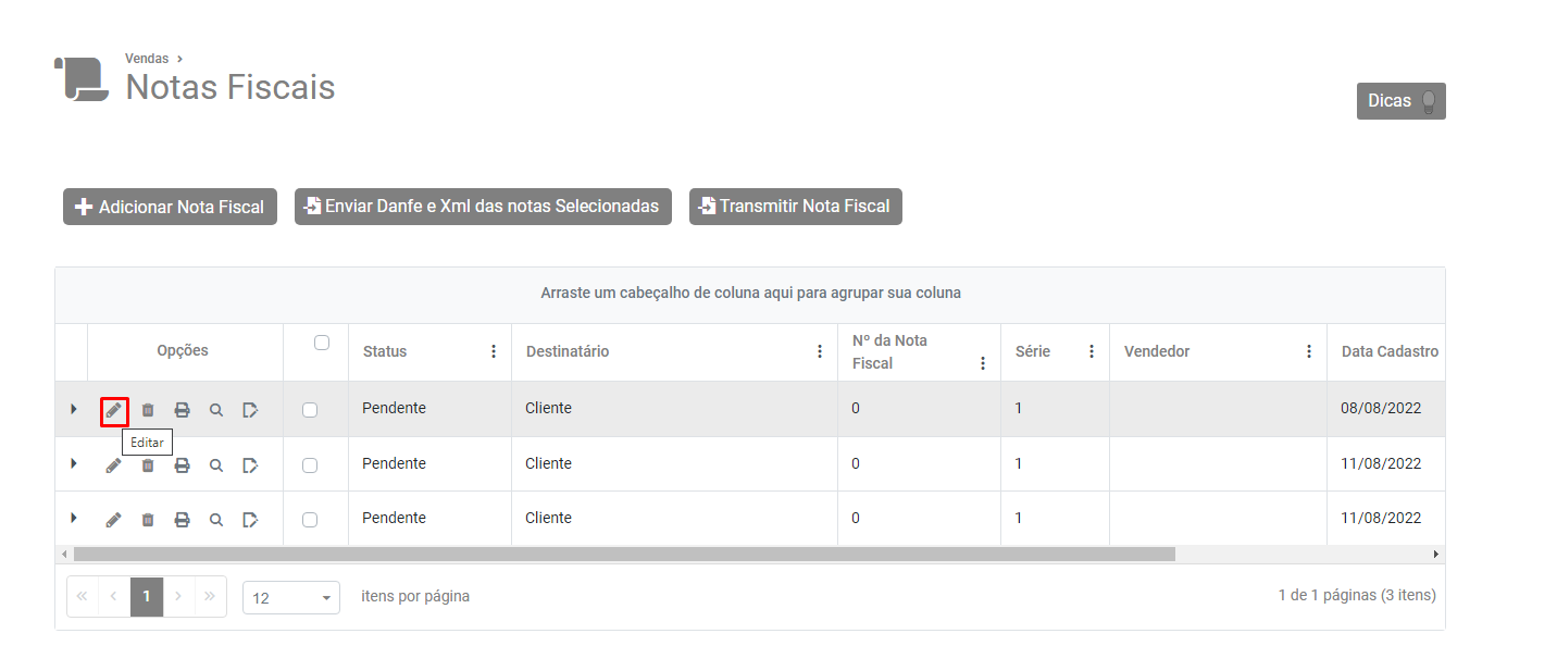 Em seguida será necessário editar a NFe, acesse o menu Vendas>Nota Fiscal Eletrônica