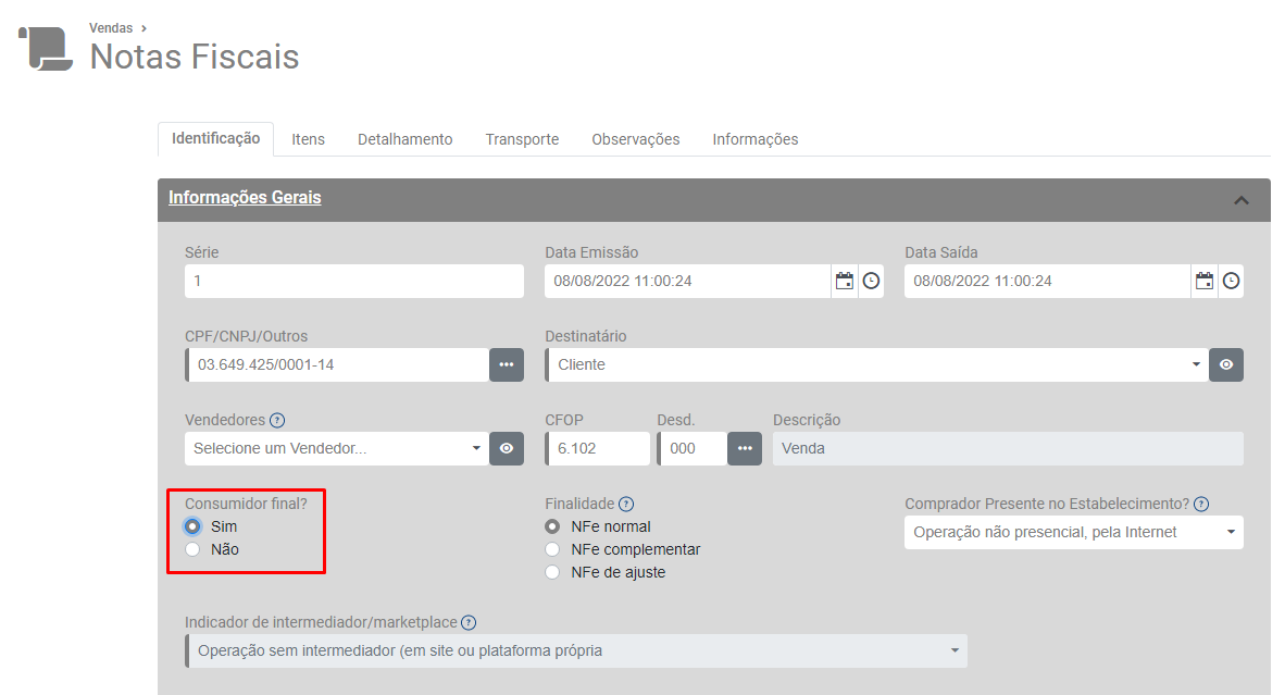 Descrição: Operação com não contribuinte deve indicar operação com consumidor final