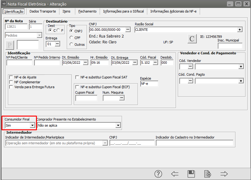 Em seguida verifique se a NF-e cadastrada está definindo que o Destinatário da NF-e é consumidor final.